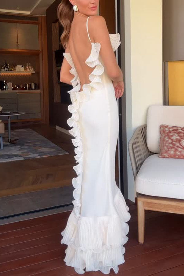 Alisin Pleated Chiffon Wavy Ruffles Trim Slip Maxi Dress