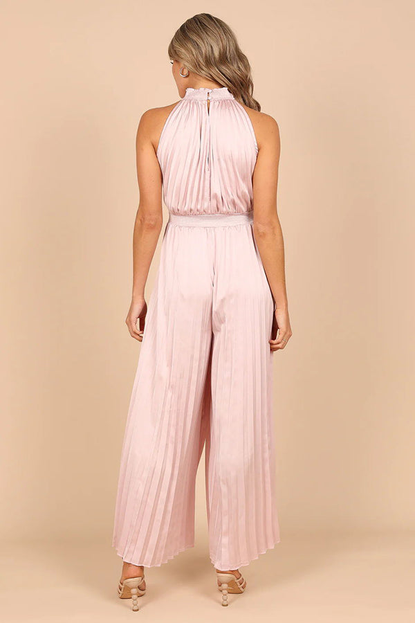Callie Satin Halter Cutout Neck Pleated Elastic Waist Jumpsuit
