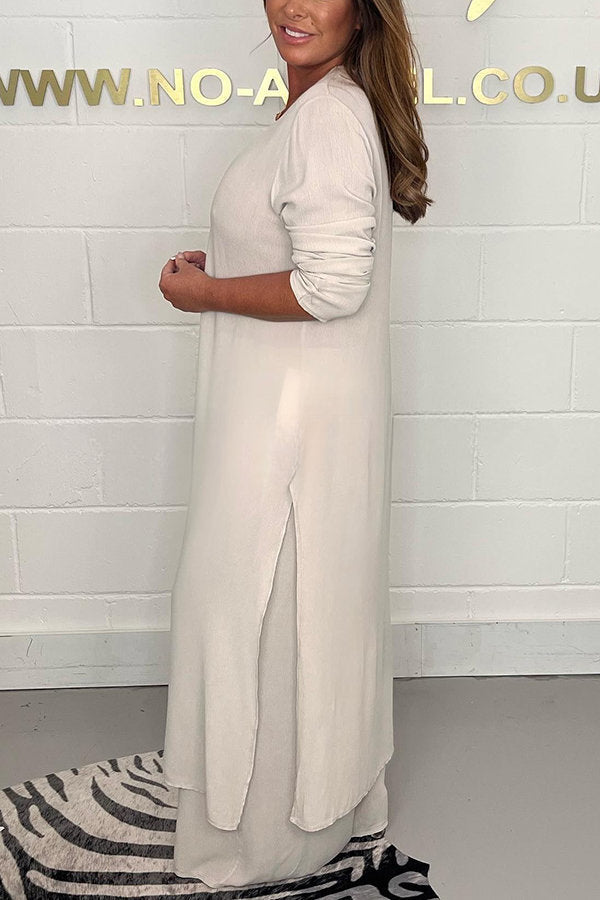 Classic Comfort V Neck Split Long Sleeve Top and Elastic Waist Flare Pants Set