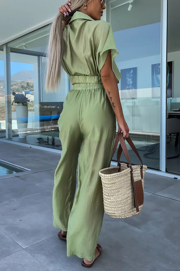 First Choice for Vacation Wrap Blouse and Pocketed Elastic Waist Pants Set