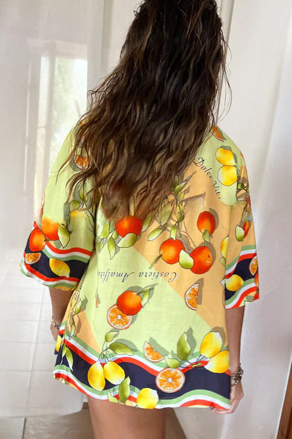 Fruity Citrus Linen Blend Printed Button Down Vacation Blouse