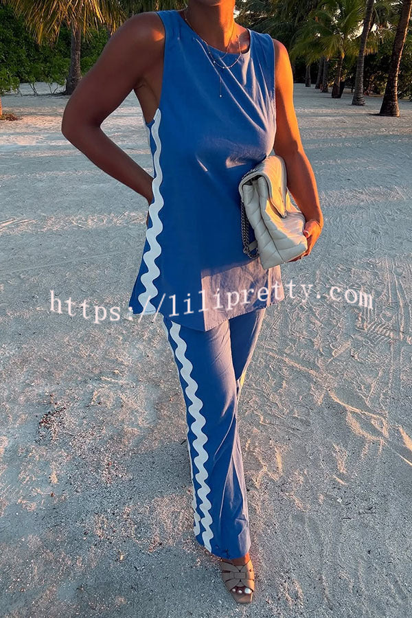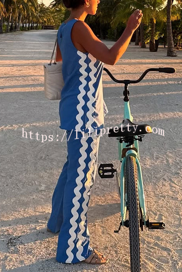 Tash Linen Blend Ric Rac Wave Trim Tank and Elastic Waist Pocket Flare Pants Set