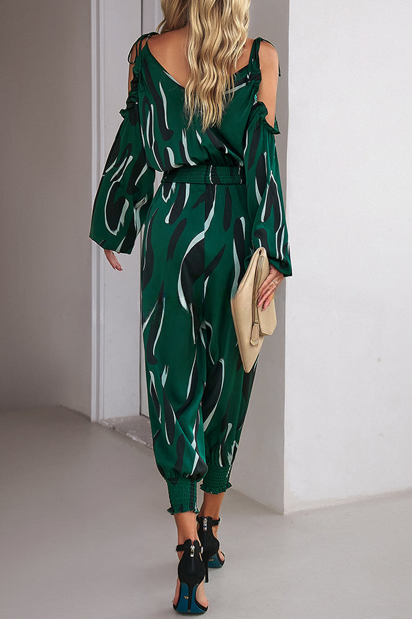 Graphic Print Stretch Waist Tie Long Sleeve Jumpsuit