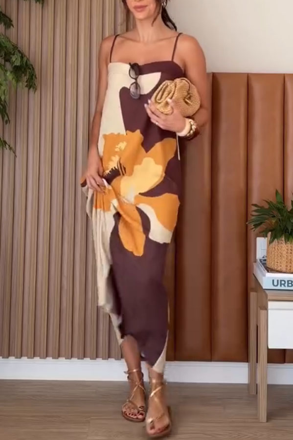Light Breeze Color-block Floral Print Adjustable Strap H-line Midi Dress