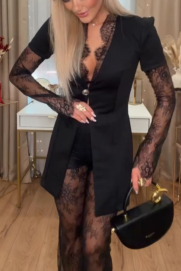Margot Lace Patchwork Single-button Long Blazer and Lace Elastic Waist Flared Pants Set