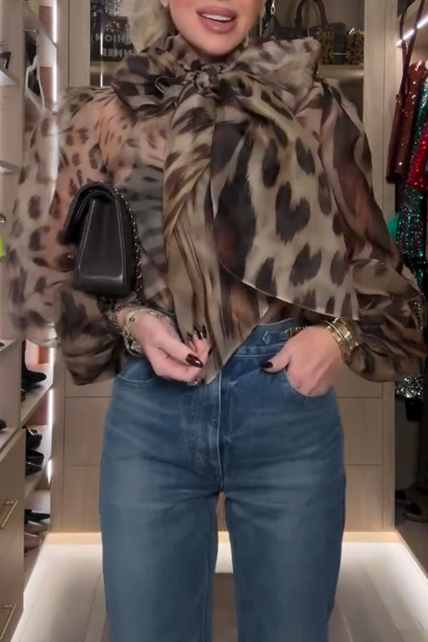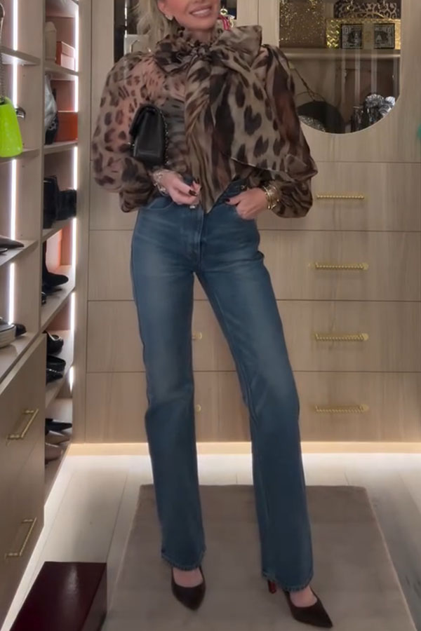 Peregrine Semi-sheer Silk Animal Print Bow Neck Balloon Sleeve Loose Blouse