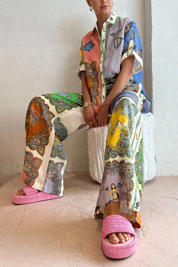 Pretty and Posh Linen Blend Mermaid Print Button Down Oversized Blouse