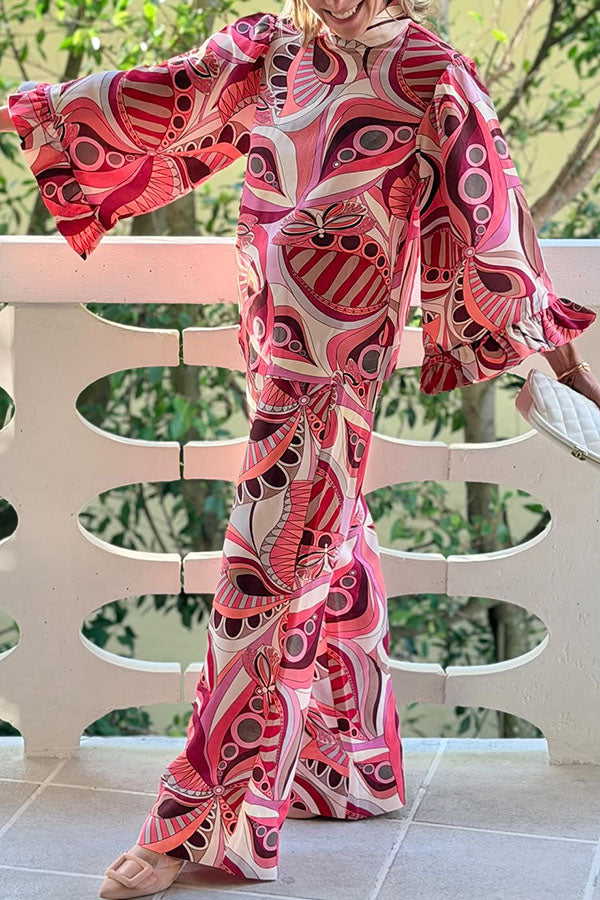 Sarah Unique Print High Neck Ruffle Bell Sleeve Top and Elastic Waist Pocket Loose Pants Set