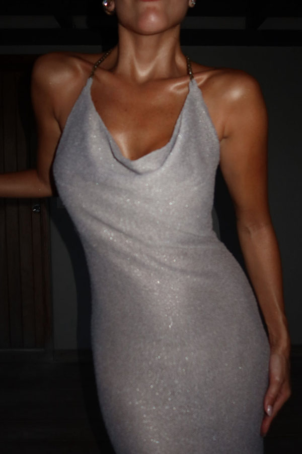 - This exquisitely elegant knit dress exudes personality. adorned with subtle metallic threads. making it the perfect choice for radiating shine on a sunny day. The front design resembles a slip dress at the bust. with a beautifully flowing drape. At the back. the deep V-neckline complements the vintage chain straps. creating a modern and striking contrast. Whether strolling at sunset or enjoying dinner on the beach. it effortlessly complements any occasion.Our distinctive clothing will add instant style to your wardrobe .