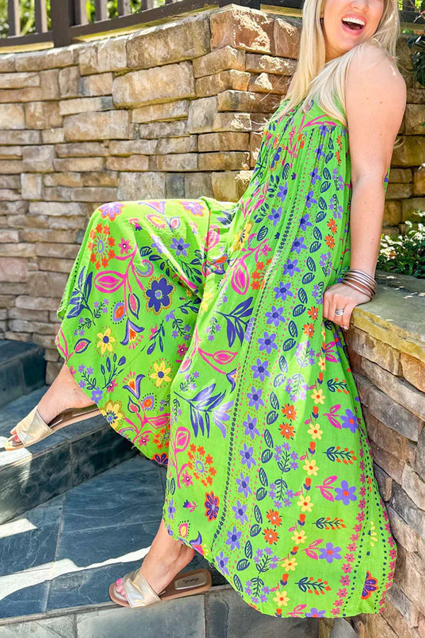 Vintage Boho Floral Print Pocketed Loose Jumpsuit