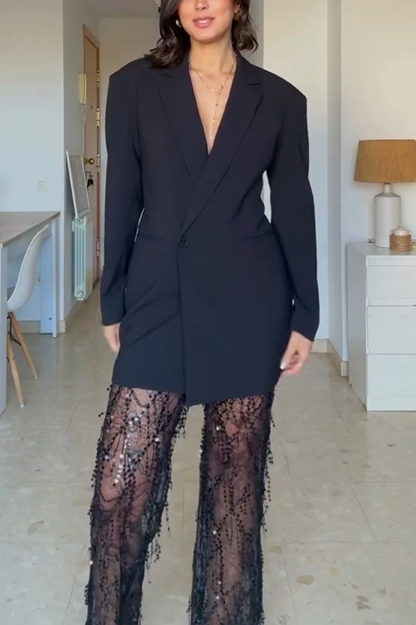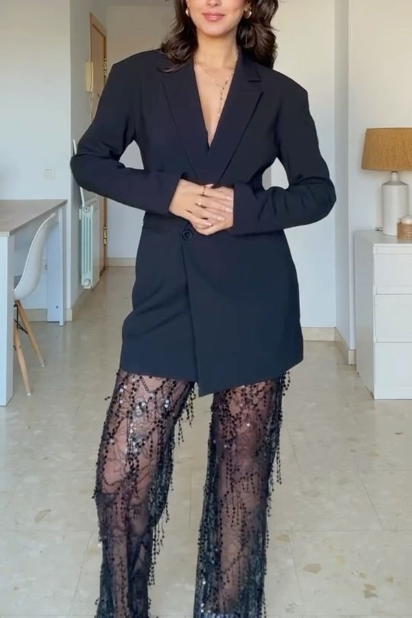 Yulissa Layered Sequin Tassels Mid Rise Stretch Wst Wide Leg Pants